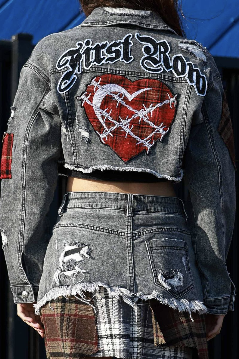 Plaid Applique Denim Crop Trucker Jacket